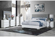 The Talia White Bedroom Collection by Global Furniture USA. This collection is finished in a sleek white finish, exuding elegance and contemporary style. Each piece features textured drawer fronts and modern chrome accents, adding a touch of sophistication. The standout upholstered headboard of the bed includes LED accent lighting, creating a serene ambiance. This collection seamlessly combines functionality with modern design, making it a perfect choice for any stylish bedroom.
