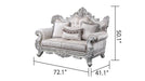 Experience cozy and classic elegance perfect for intimate spaces and moments with this loveseat. The traditional design, enriched with a champagne and silver brush finish, provides a luxurious yet warm aesthetic that is both inviting and stylish. Accompanied by three plush pillows, it is not just a seat but a haven where comfort and sophistication coexist in harmony, making every moment spent on it truly special.